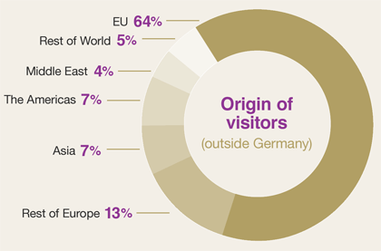 來自德國以外的參展商和觀眾的比例分別為48%和34%,海外參展商的比例繼續有所增加,但海外觀眾的比例有輕微下跌。繼德國之后參展商最多的國家分別是:意大利、土耳其、中國、荷蘭、瑞士、西班牙、奧地利、法國和美國。繼德國之后觀眾最多的國家分別是:奧地利、荷蘭、瑞典、瑞士、英國、意大利、丹麥、比利時、印度、捷克共和國和波蘭。