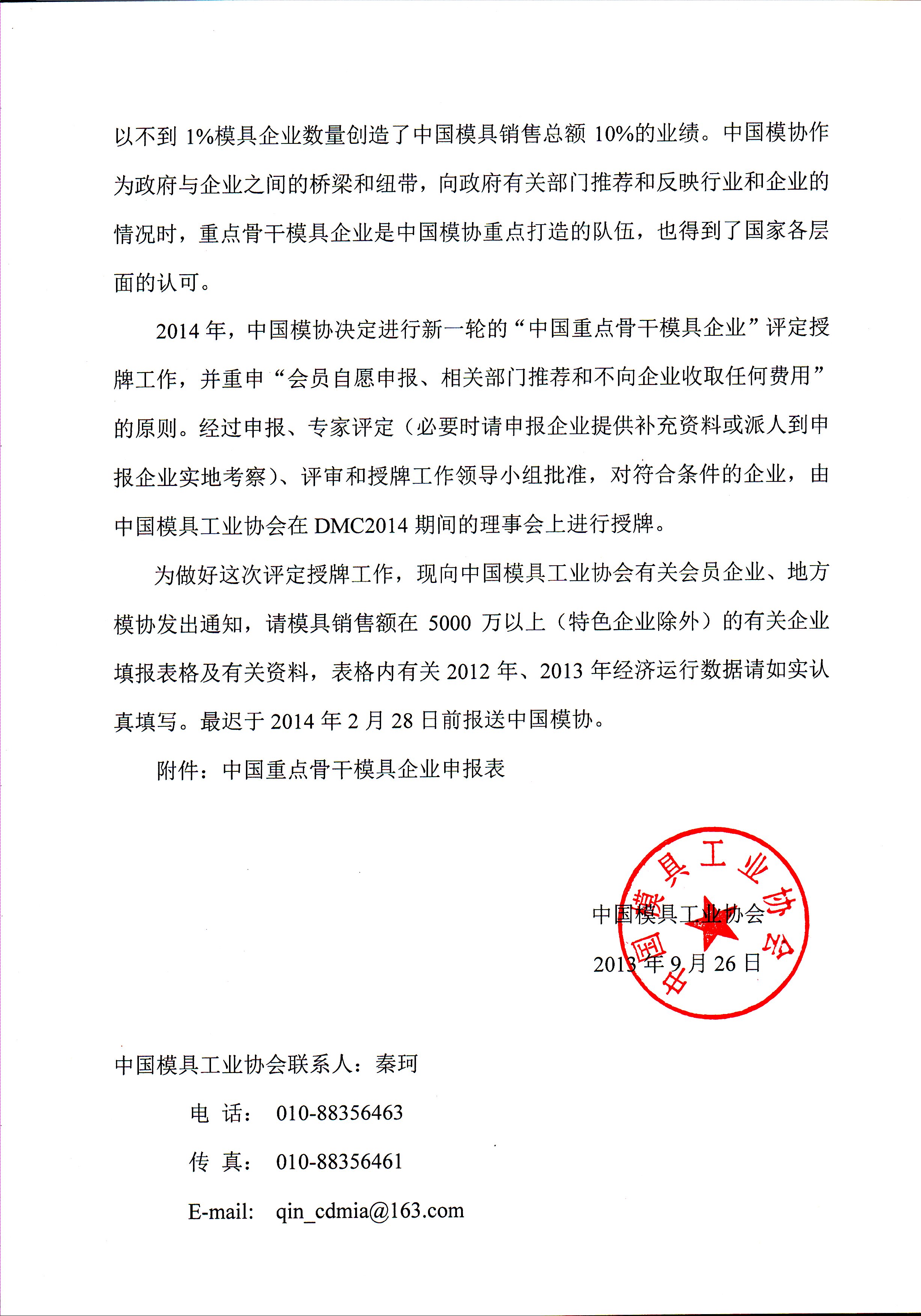 關(guān)于開展2014年“中國重點(diǎn)骨干模具企業(yè)”評定工作的通知