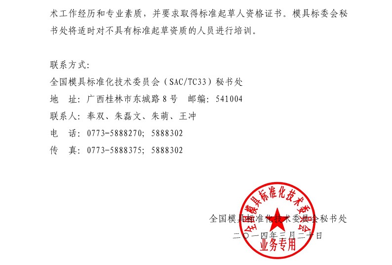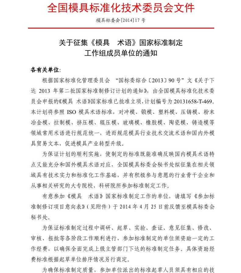 關(guān)于征集《模具 術(shù)語》國家標(biāo)準(zhǔn)制定工作組成員單位的通知