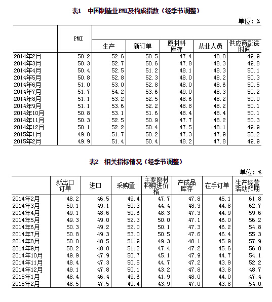2015年2月,中國制造業采購經理指數(PMI)為49.9%,比上月微升0.1個百分點,表明制造業收縮幅度收窄。