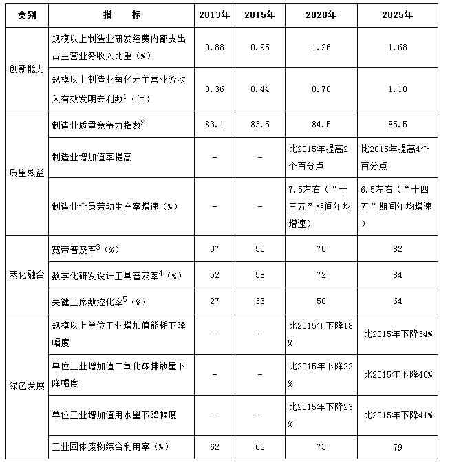 到2025年,制造業(yè)整體素質(zhì)大幅提升,創(chuàng)新能力顯著增強,全員勞動生產(chǎn)率明顯提高,兩化(工業(yè)化和信息化)融合邁上新臺階。重點行業(yè)單位工業(yè)增加值能耗、物耗及污染物排放達(dá)到世界先進(jìn)水平。形成一批具有較強國際競爭力的跨國公司和產(chǎn)業(yè)集群,在全球產(chǎn)業(yè)分工和價值鏈中的地位明顯提升。