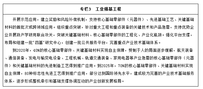 核心基礎(chǔ)零部件(元器件)、先進(jìn)基礎(chǔ)工藝、關(guān)鍵基礎(chǔ)材料和產(chǎn)業(yè)技術(shù)基礎(chǔ)(以下統(tǒng)稱“四基”)等工業(yè)基礎(chǔ)能力薄弱,是制約我國制造業(yè)創(chuàng)新發(fā)展和質(zhì)量提升的癥結(jié)所在。要堅持問題導(dǎo)向、產(chǎn)需結(jié)合、協(xié)同創(chuàng)新、重點突破的原則,著力破解制約重點產(chǎn)業(yè)發(fā)展的瓶頸。