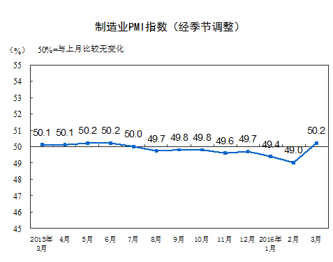 中國經濟網北京4月1日訊 今天,國家統計局發布3月份制造業數據,數據顯示,3月中國制造業采購經理指數(PMI)為50.2%,比上月上升1.2個百分點,重回擴張區間?!?/span>
