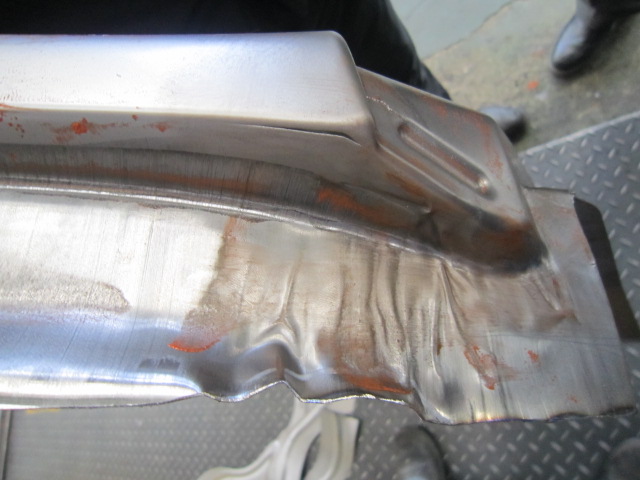 該側圍外板模具經過長時間的調試,最突出的難點最終表現在零件A柱上部(圖1A處)側翻邊時容易開裂,并在前端形成疊料,嚴重影響模具的開發進程,進而影響裝車。產品形狀和翻邊開裂疊料情況如圖5和圖6所示。