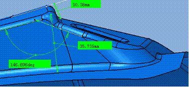 如圖7所示,該側圍外板產品A柱上部側翻邊高度大(一般的側圍高度為25mm,該側圍高35mm),與翼子板搭接面臺階高10mm(一般的側圍高度為5~8mm),翻邊線夾角很小的“三角形”,夾角只有146.7度左右(夾角越接近180度越不會形成疊料),導致側翻邊時在最高的尖角處撕裂。另外,此形狀決定了拉延時在“三角形”區域聚集了過多的材料,而此處側翻邊時的法蘭面為平面,把三角形狀的材料在側圍邊上整形為平面,如果排不出多余的材料必然形成疊料。