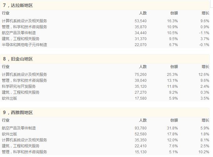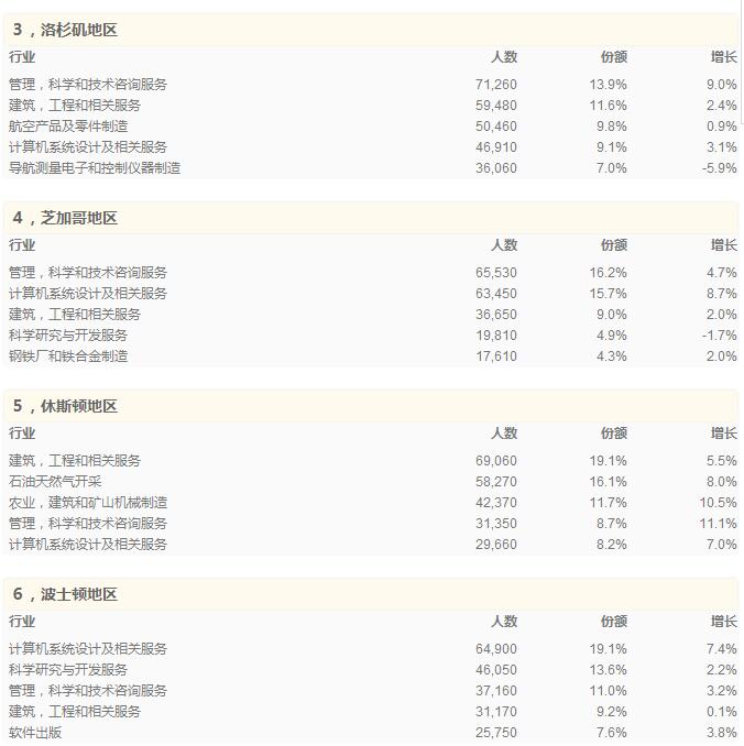 下面是最大的10個都會中心的最大的5個產業的細節。份額是指該行業人員占該地區先進產業總人數的比例,增長是指2013到2015年的增長。