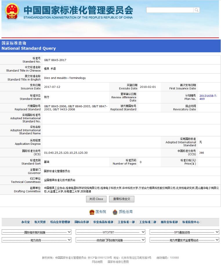《模具 術(shù)語》GB/T 8845-2017將于2018年2月1日正式實施