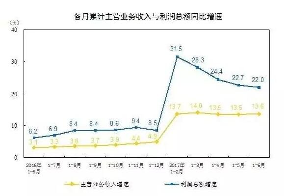 據國家統(tǒng)計局工業(yè)司何平博士解讀表示,2017年6月份,中國規(guī)模以上工業(yè)企業(yè)利潤同比增長19.1%,增速比5月份加快2.4個百分點;上半年,利潤同比增長22%,增速比1-5月份放緩0.7個百分點。