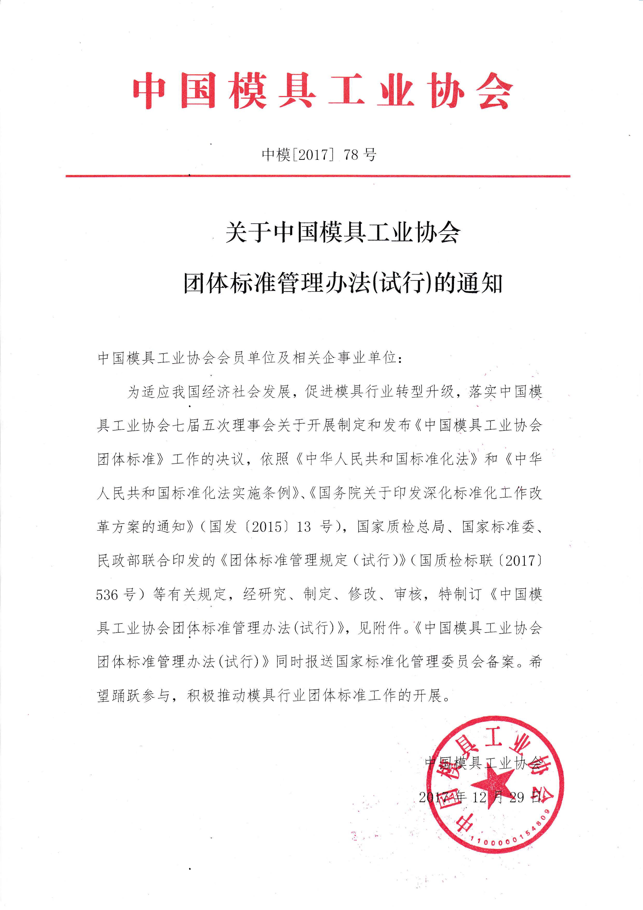 關于中國模具工業協會團體標準管理辦法(試行)的通知