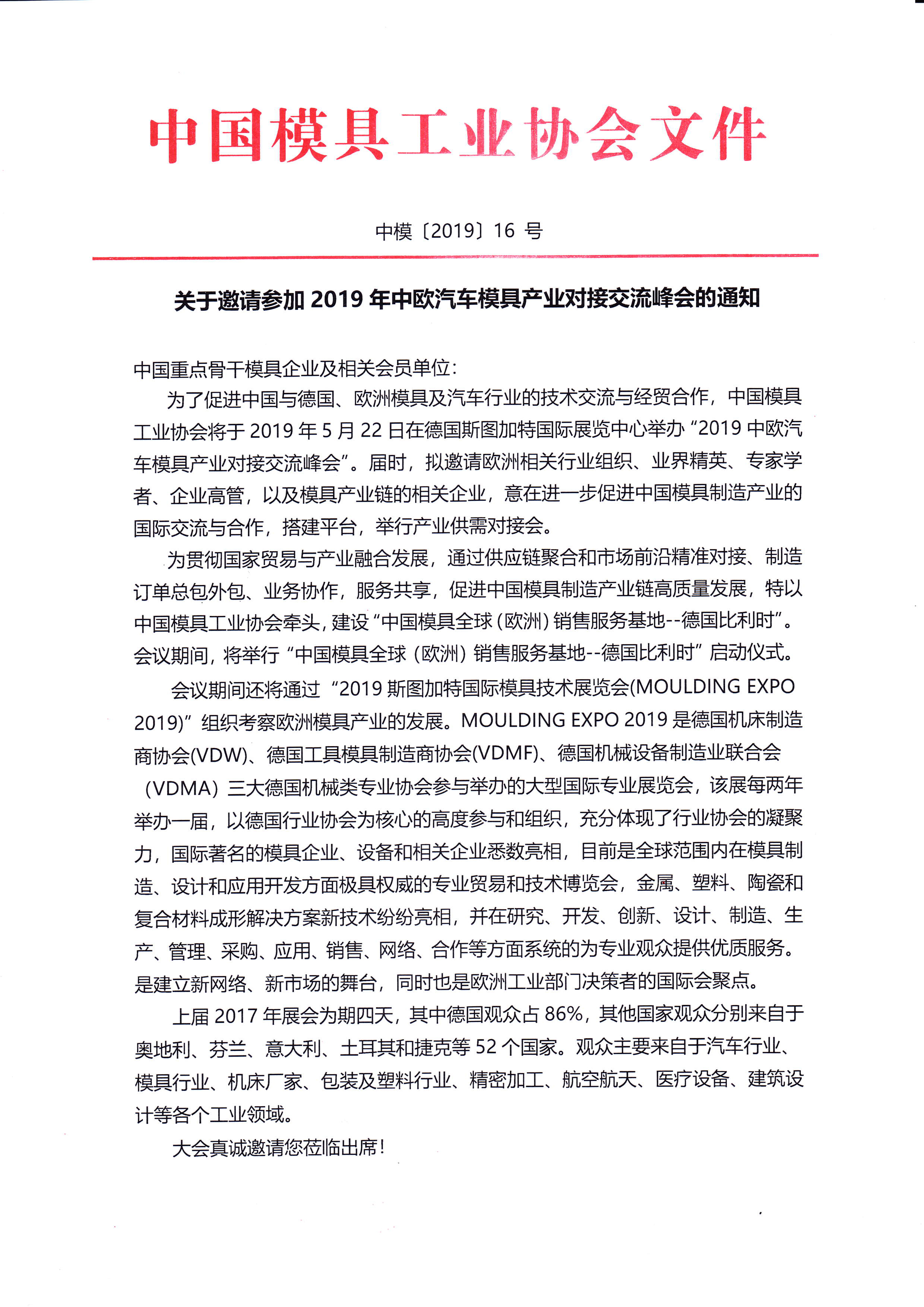 關于邀請參加2019年中歐汽車模具產業對接交流峰會的通知