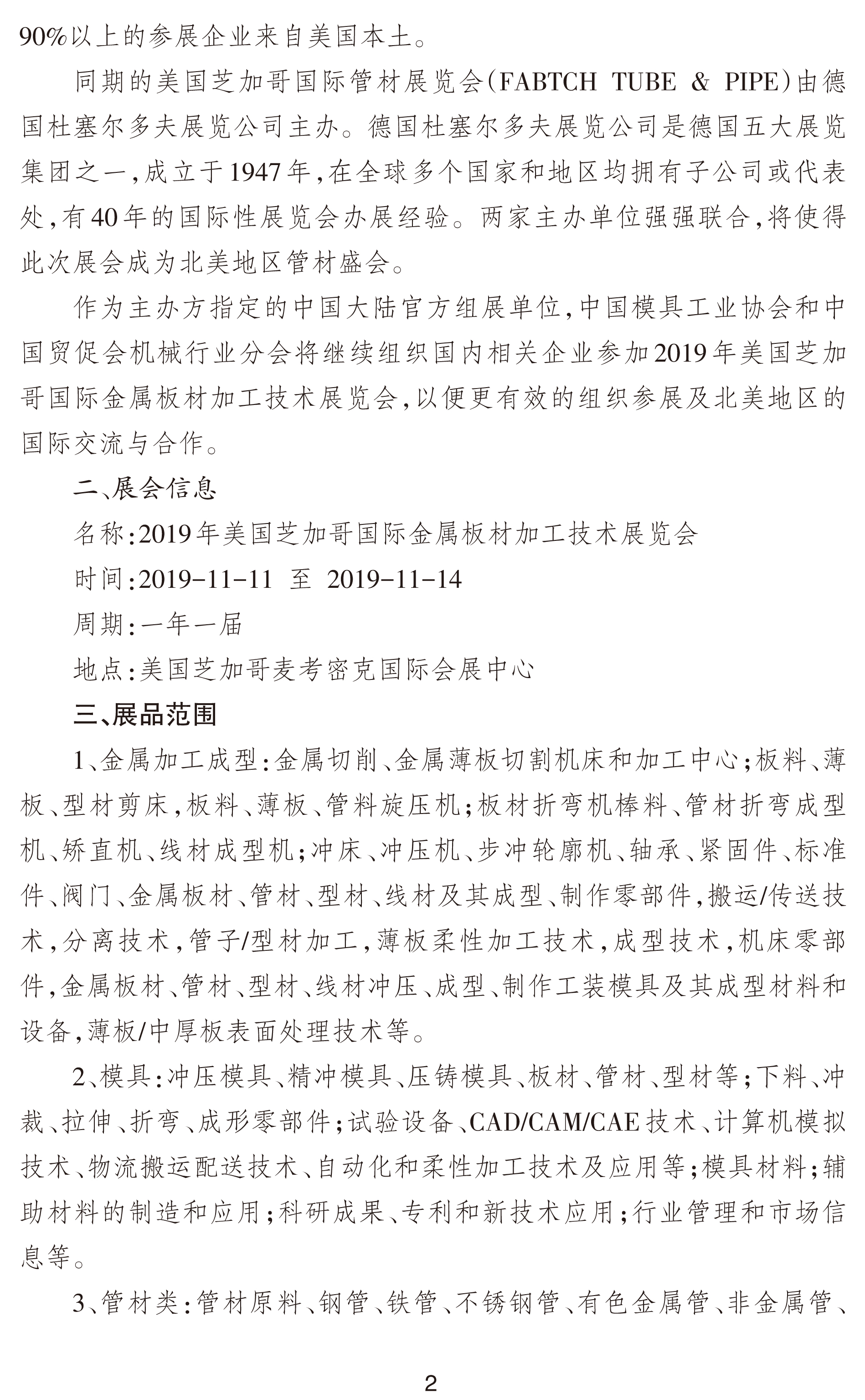 關(guān)于邀請參加2019年美國芝加哥國際金屬板材加工技術(shù)展覽會的通知