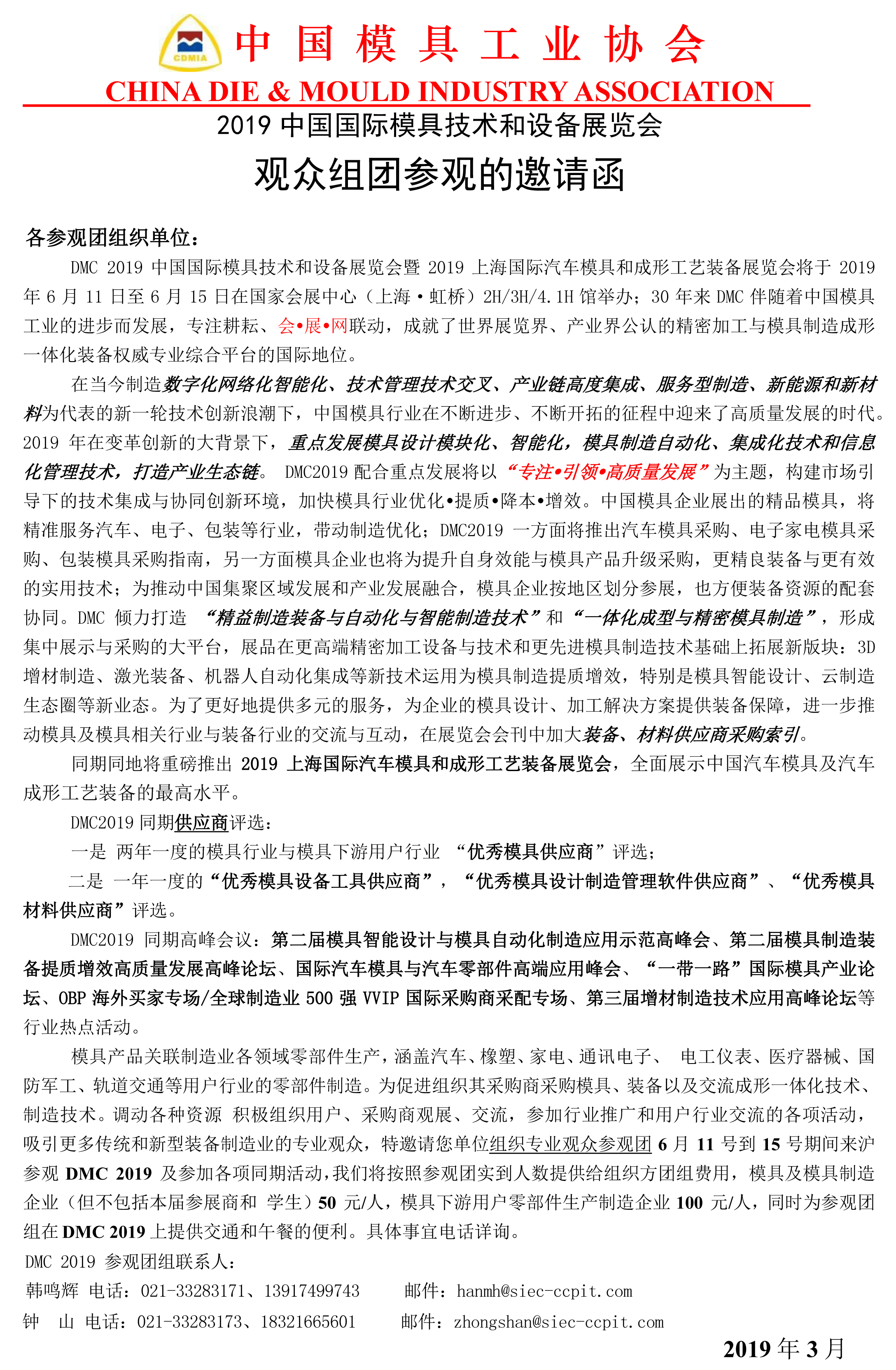 2019中國國際模具技術和設備展覽會觀眾組團參觀的邀請函