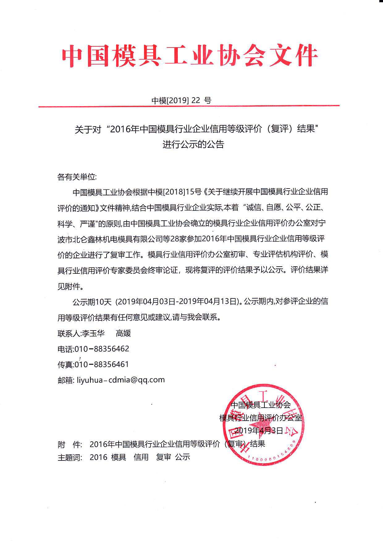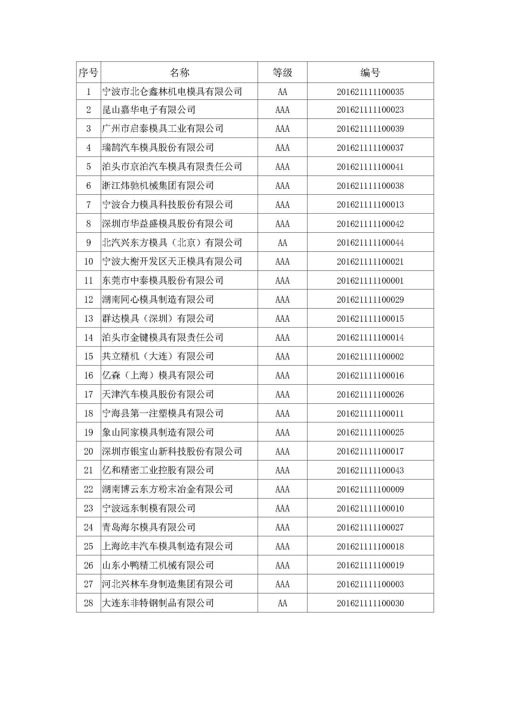 關于對“2016年中國模具行業企業信用等級評價(復評)結果”進行公示的公告