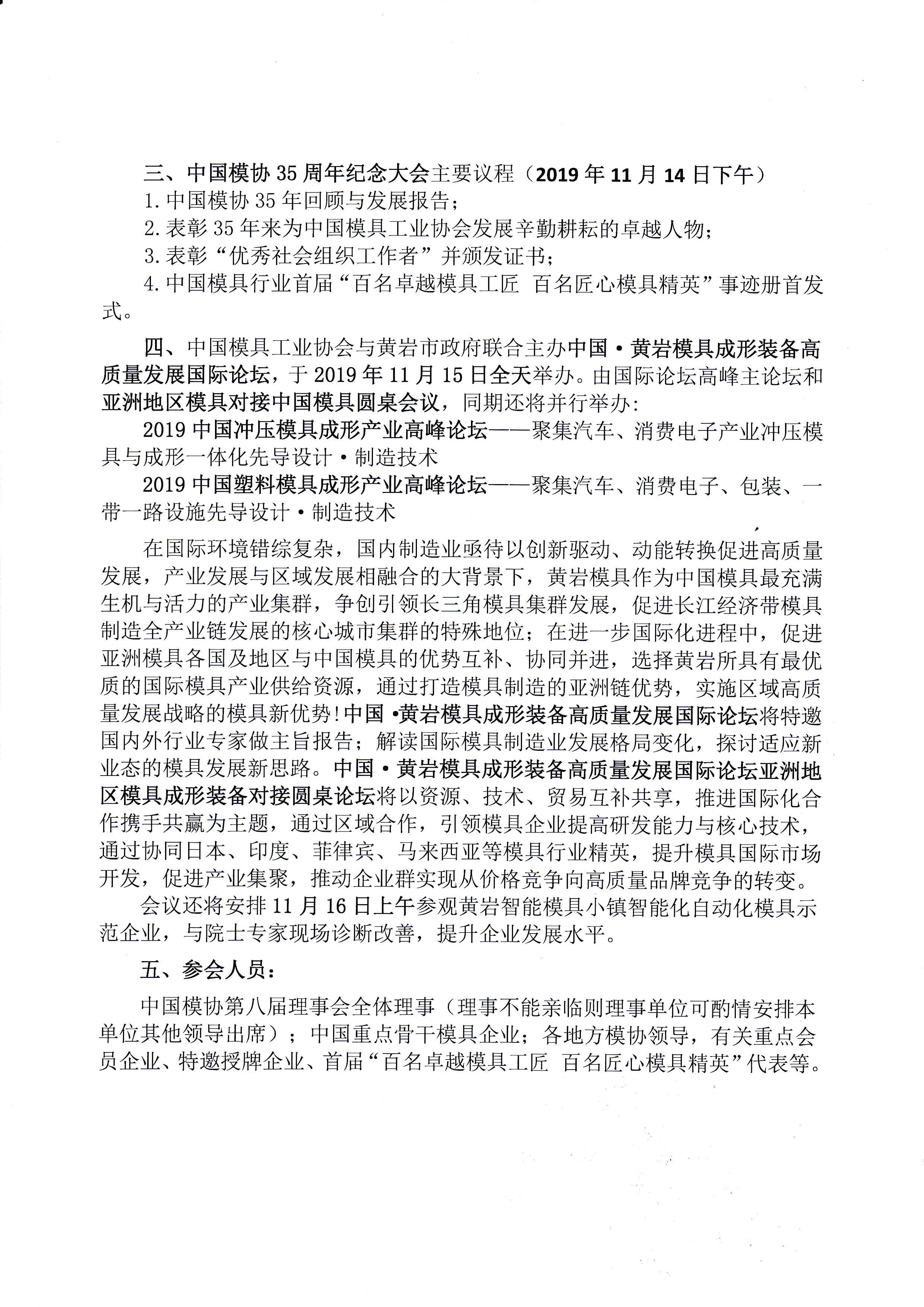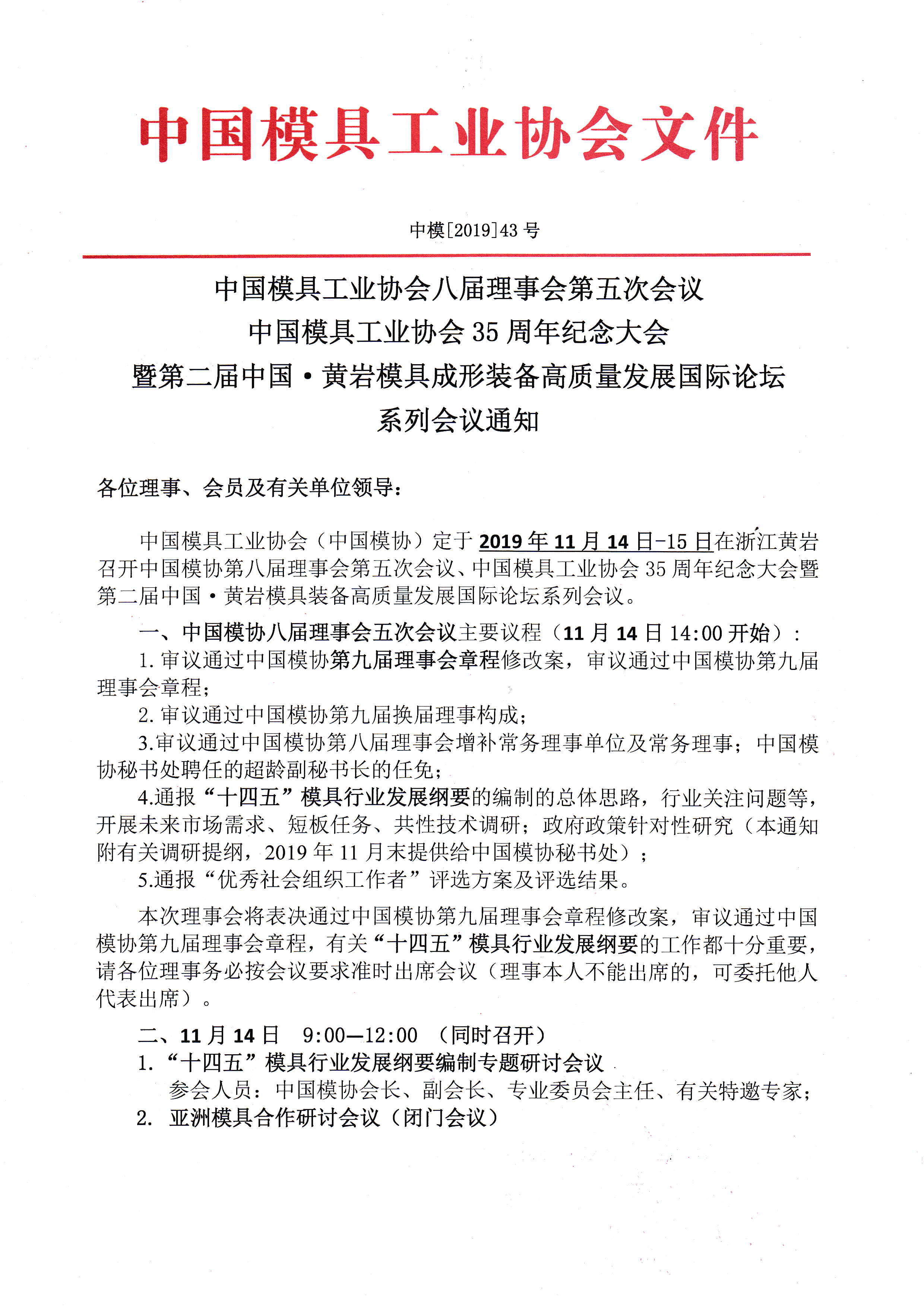 中國模具工業(yè)協(xié)會(huì)八屆理事會(huì)第五次會(huì)議 中國模具工業(yè)協(xié)會(huì)35周年紀(jì)念大會(huì)暨第二屆中國黃巖模具裝備高質(zhì)量發(fā)展國際論壇系列會(huì)議通知