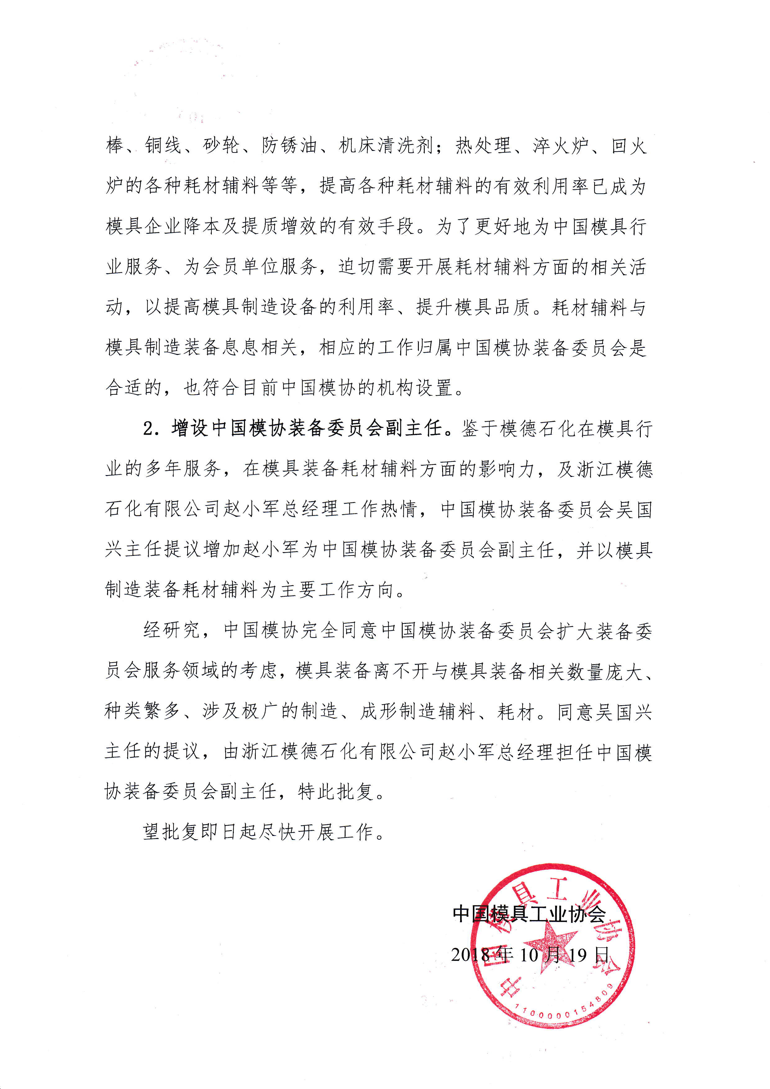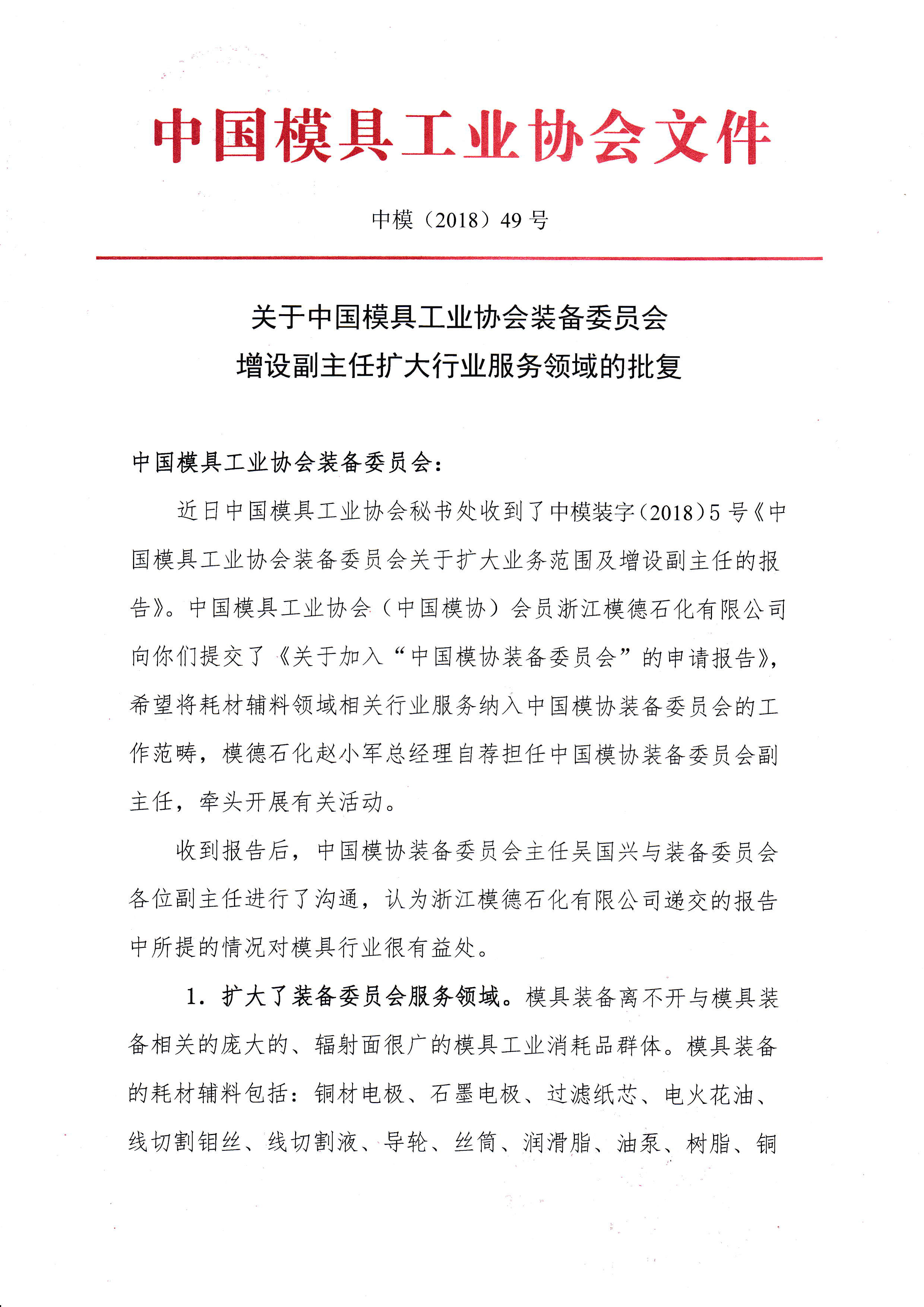 關(guān)于中國(guó)模具工業(yè)協(xié)會(huì)裝備委員會(huì)增設(shè)副主任擴(kuò)大行業(yè)服務(wù)領(lǐng)域的批復(fù)