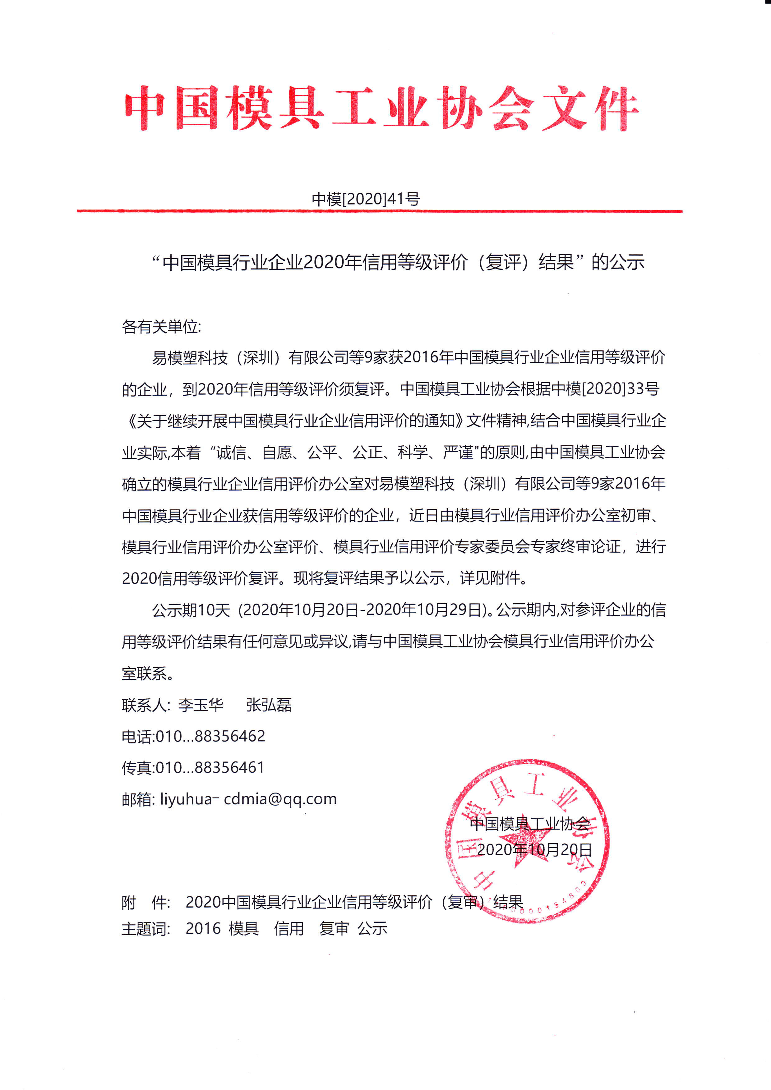 “中國模具行業(yè)企業(yè)2020年信用等級(jí)評(píng)價(jià)(復(fù)評(píng))結(jié)果”的公示