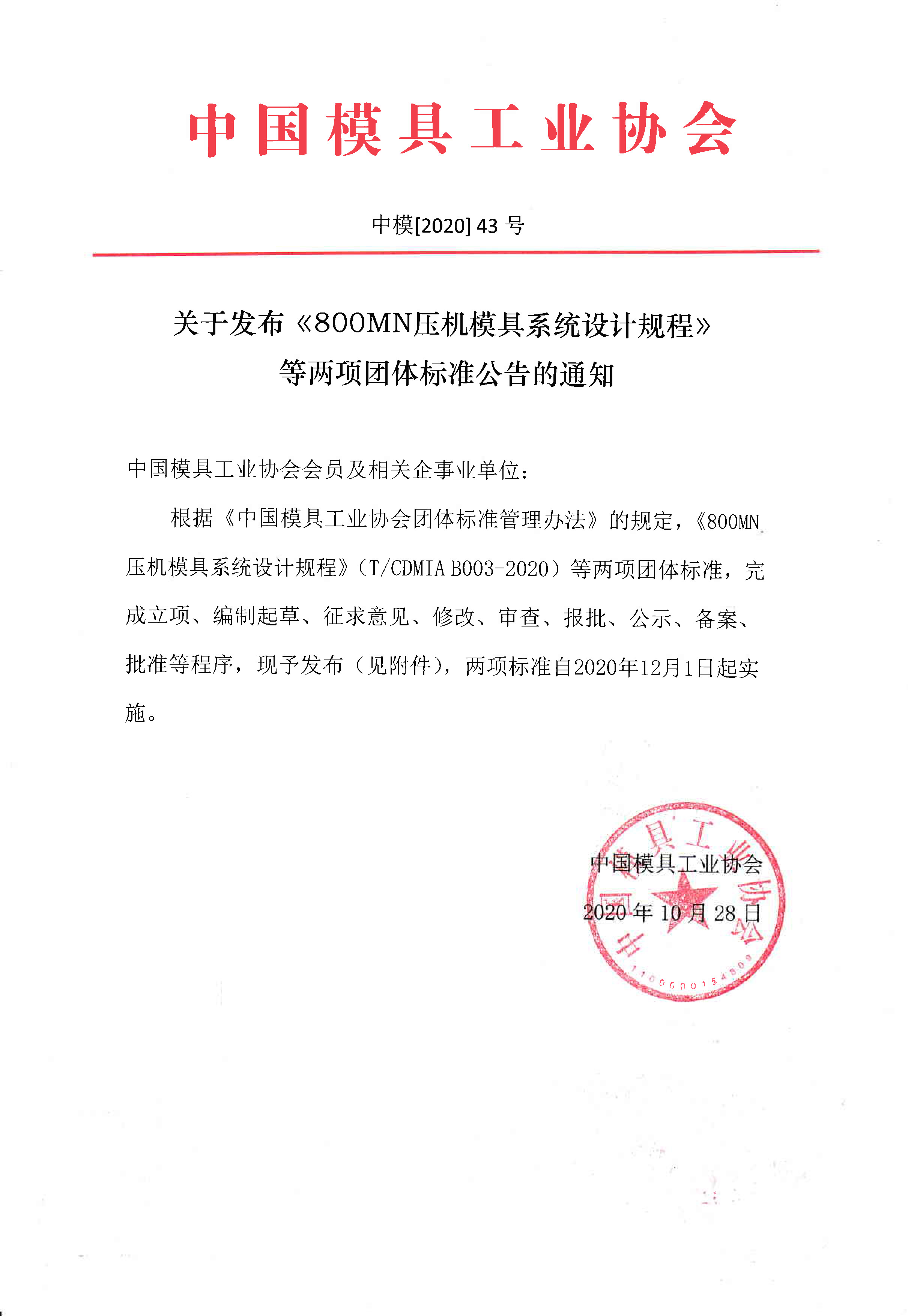 關(guān)于發(fā)布《800MN壓機(jī)模具系統(tǒng)設(shè)計(jì)規(guī)程》等兩項(xiàng)團(tuán)體標(biāo)準(zhǔn)公告的通知