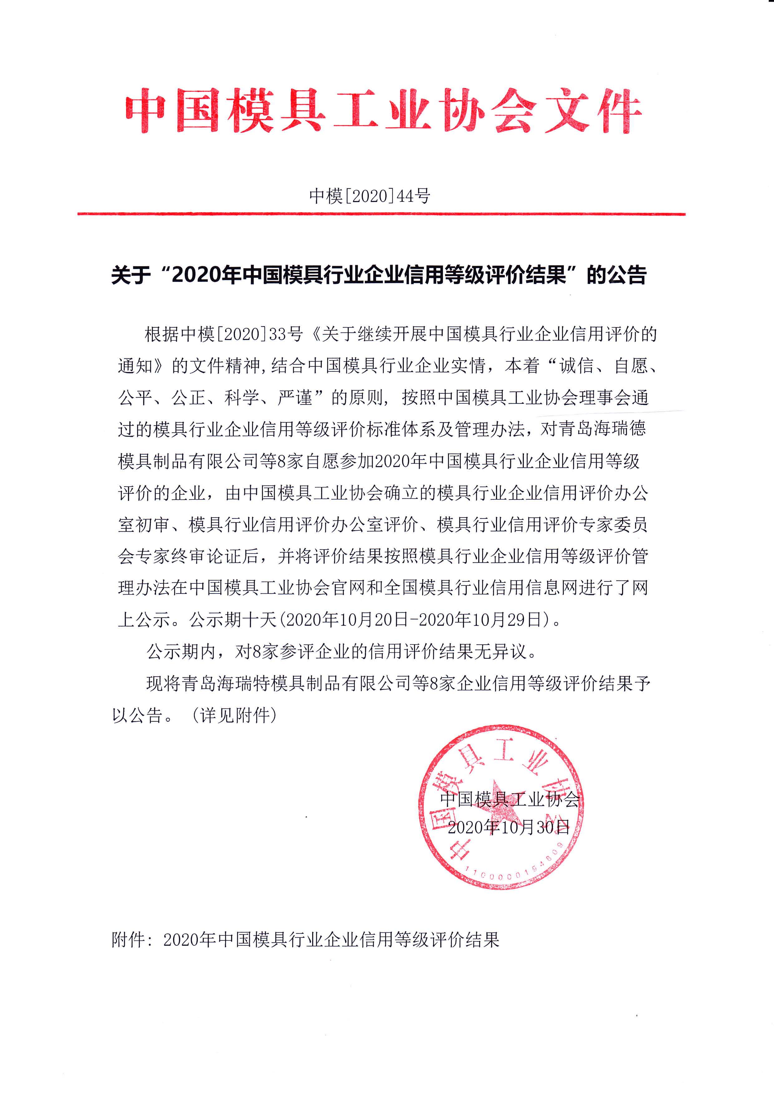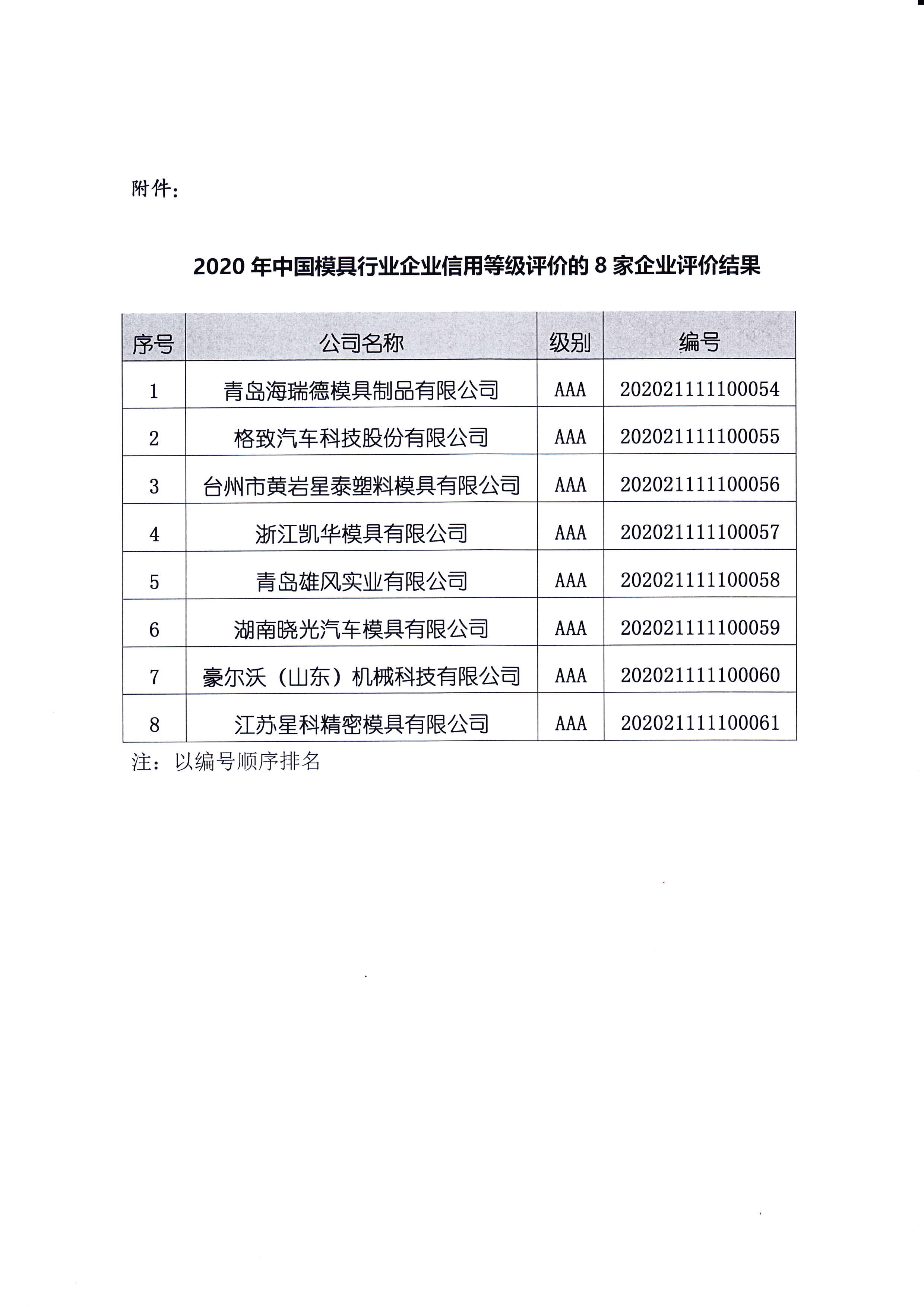 關(guān)于“2020年中國模具行業(yè)企業(yè)信用等級評價結(jié)果”的公告
