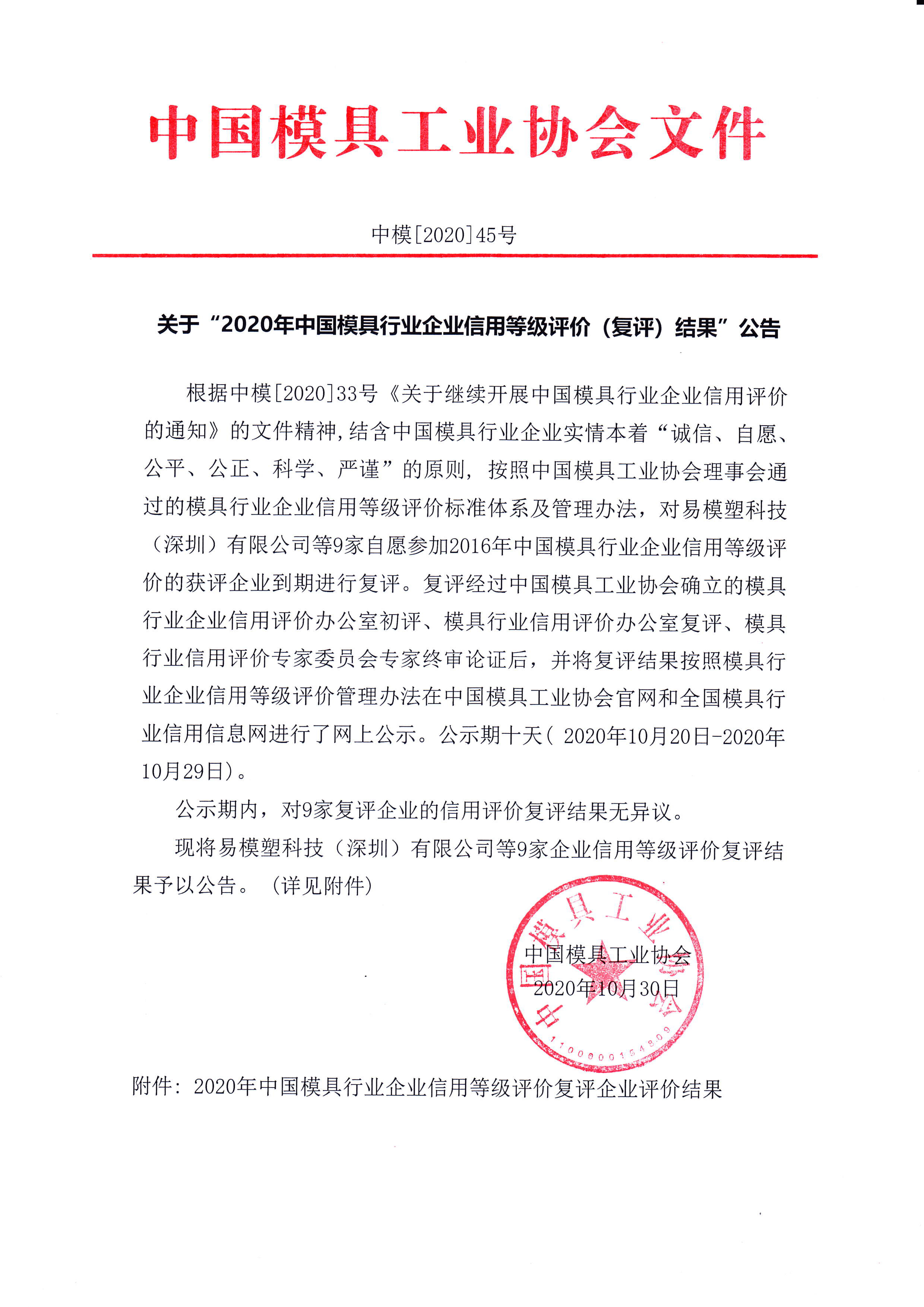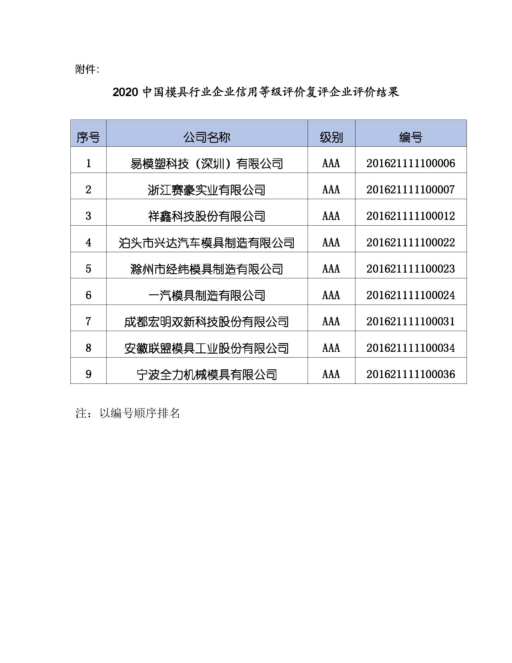 關于“2020年中國模具行業企業信用等級評價(復評)結果”公告