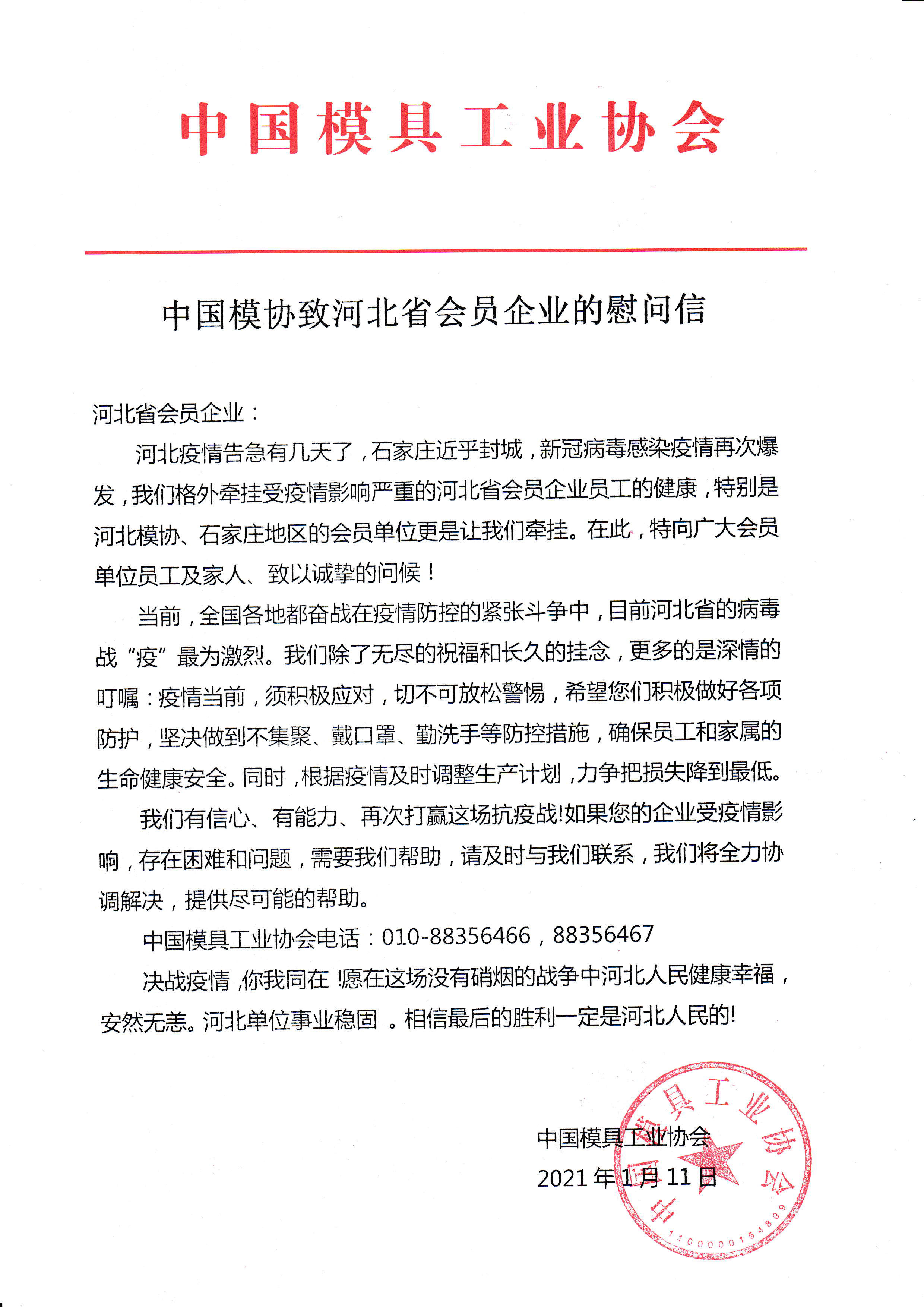 中國模協致河北省會員企業的慰問信