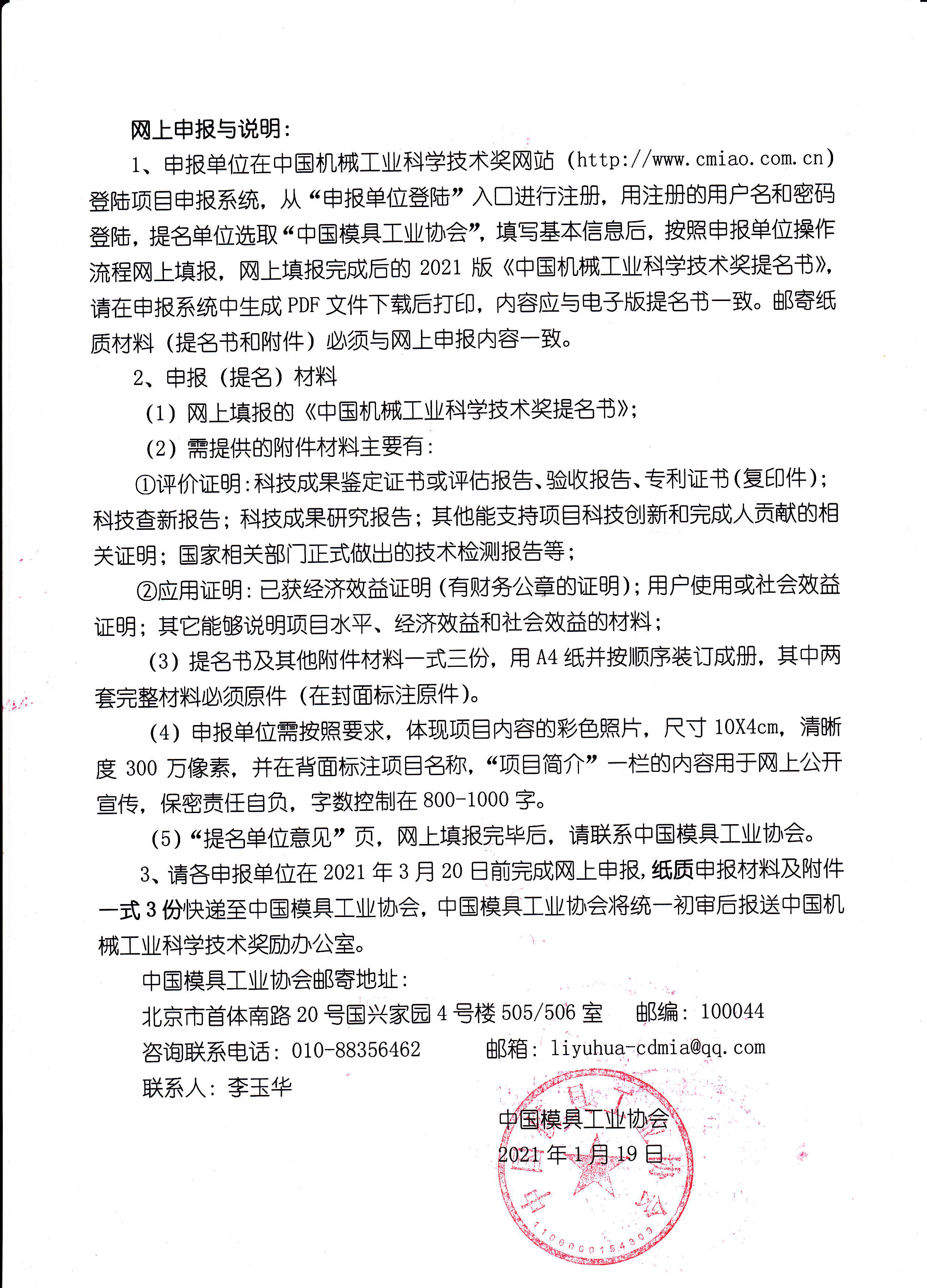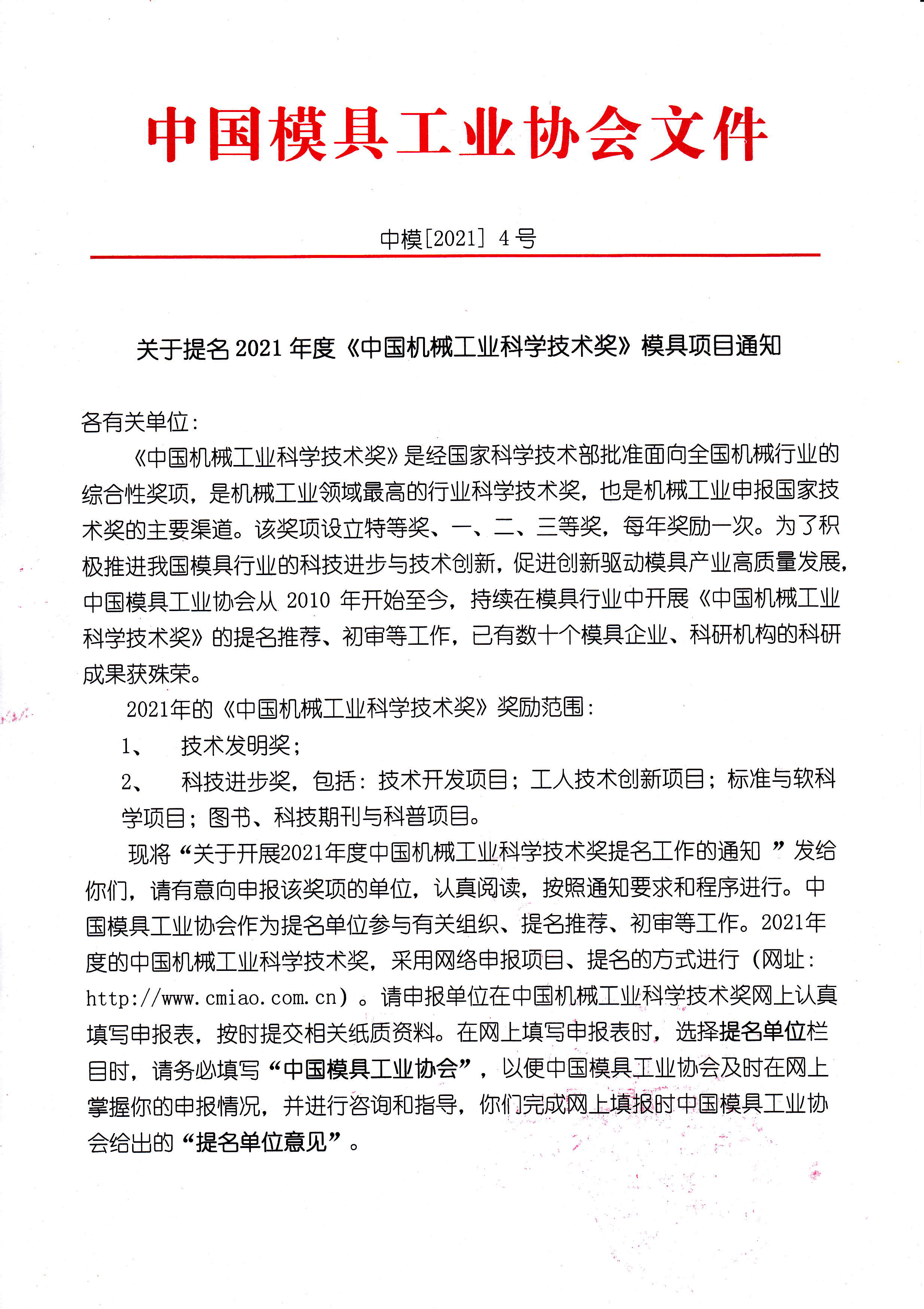 關于提名2021年度《中國機械工業科學技術獎》模具項目通知
