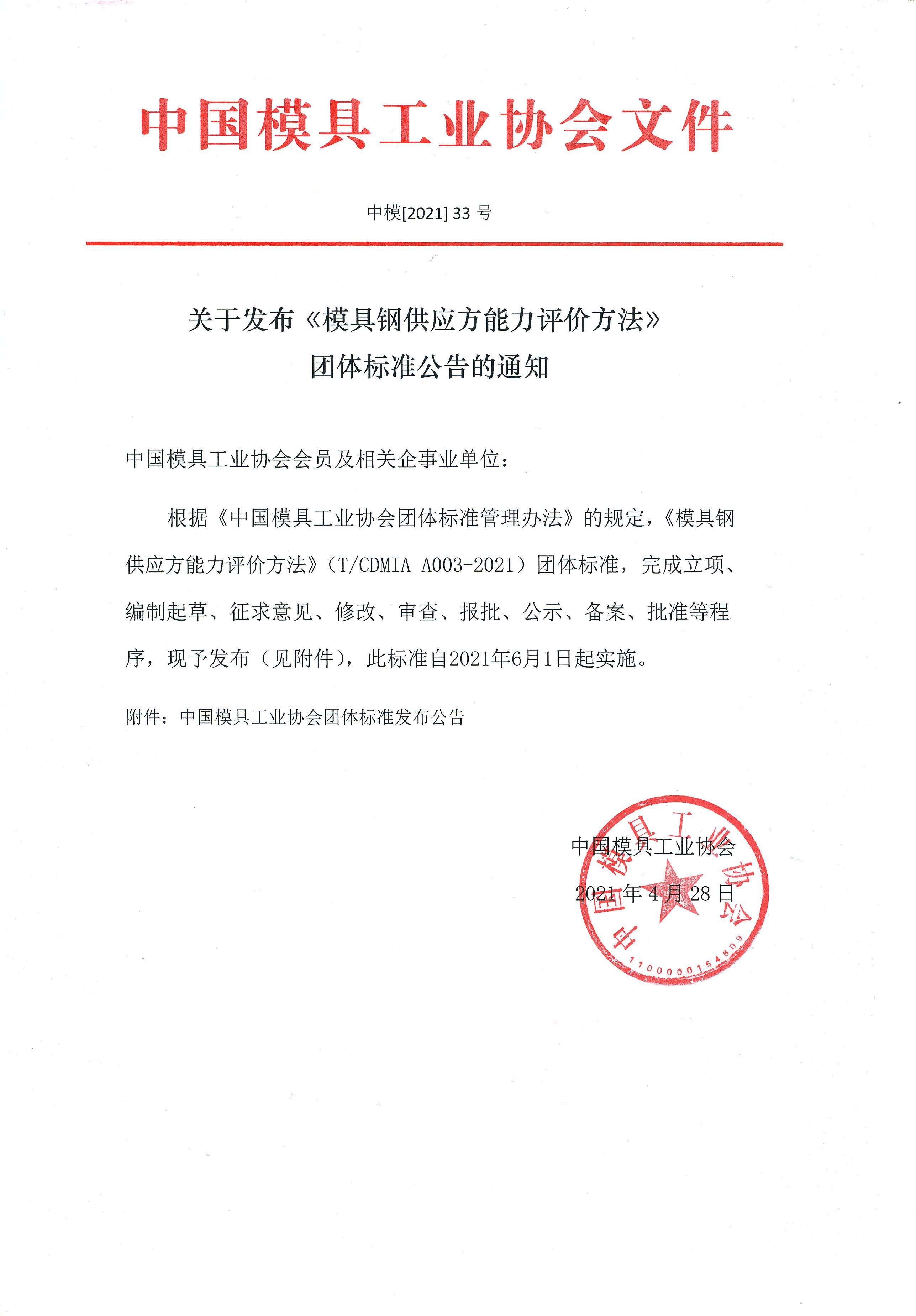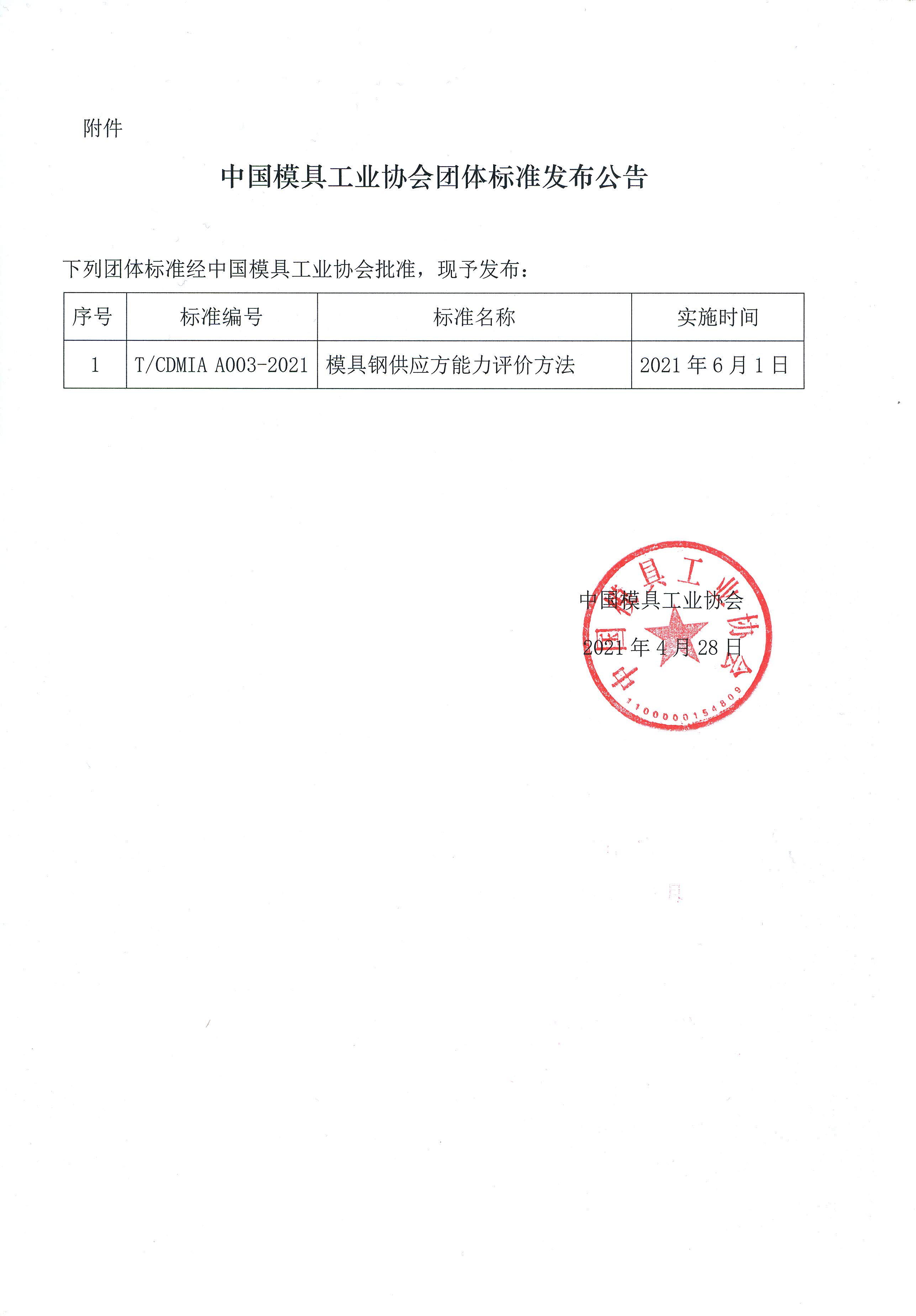 關于發布《模具鋼供應方能力評價方法》團體標準公告的通知