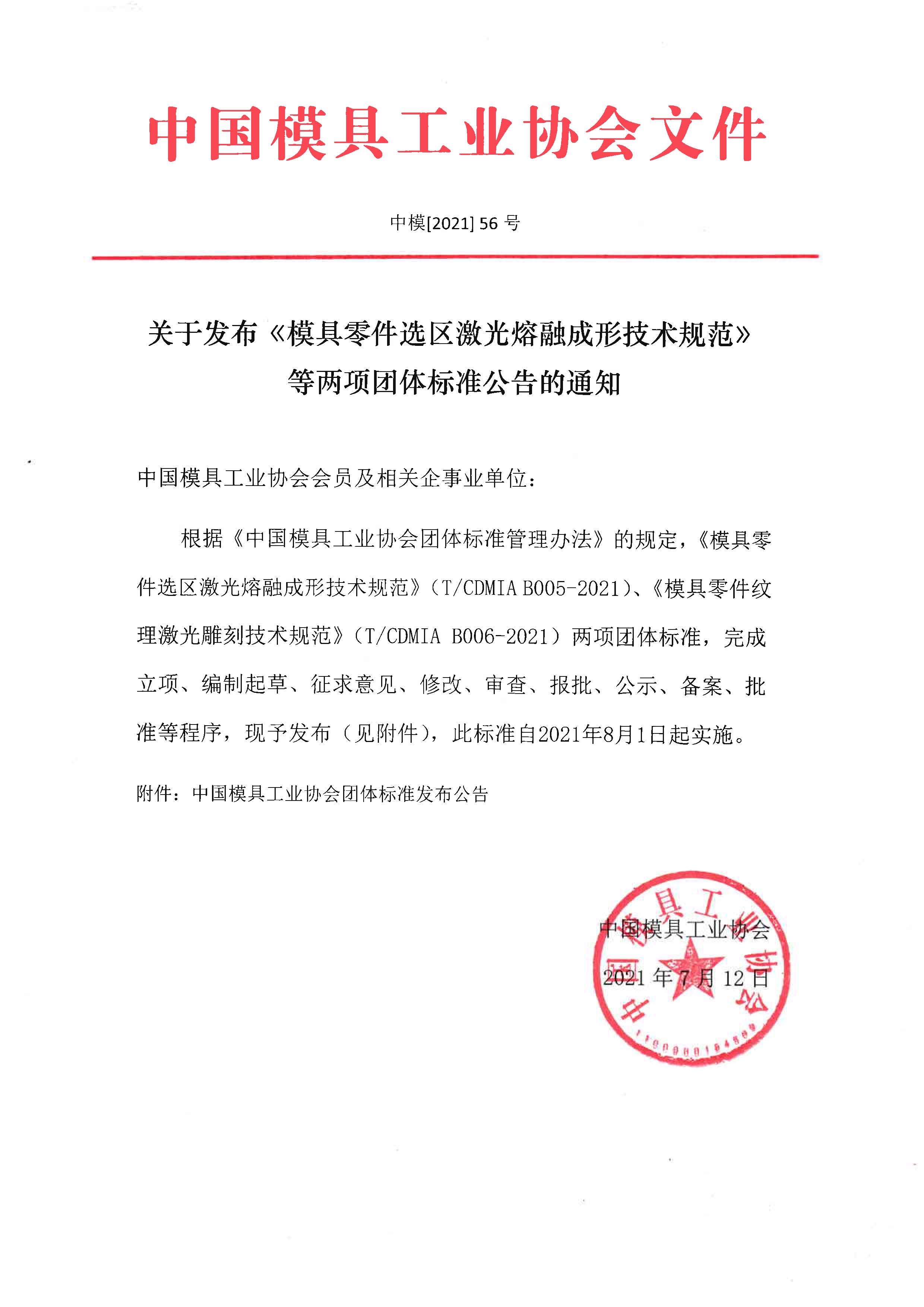 關于發布《模具零件選區激光熔融成形技術規范》等兩項團體標準公告的通知