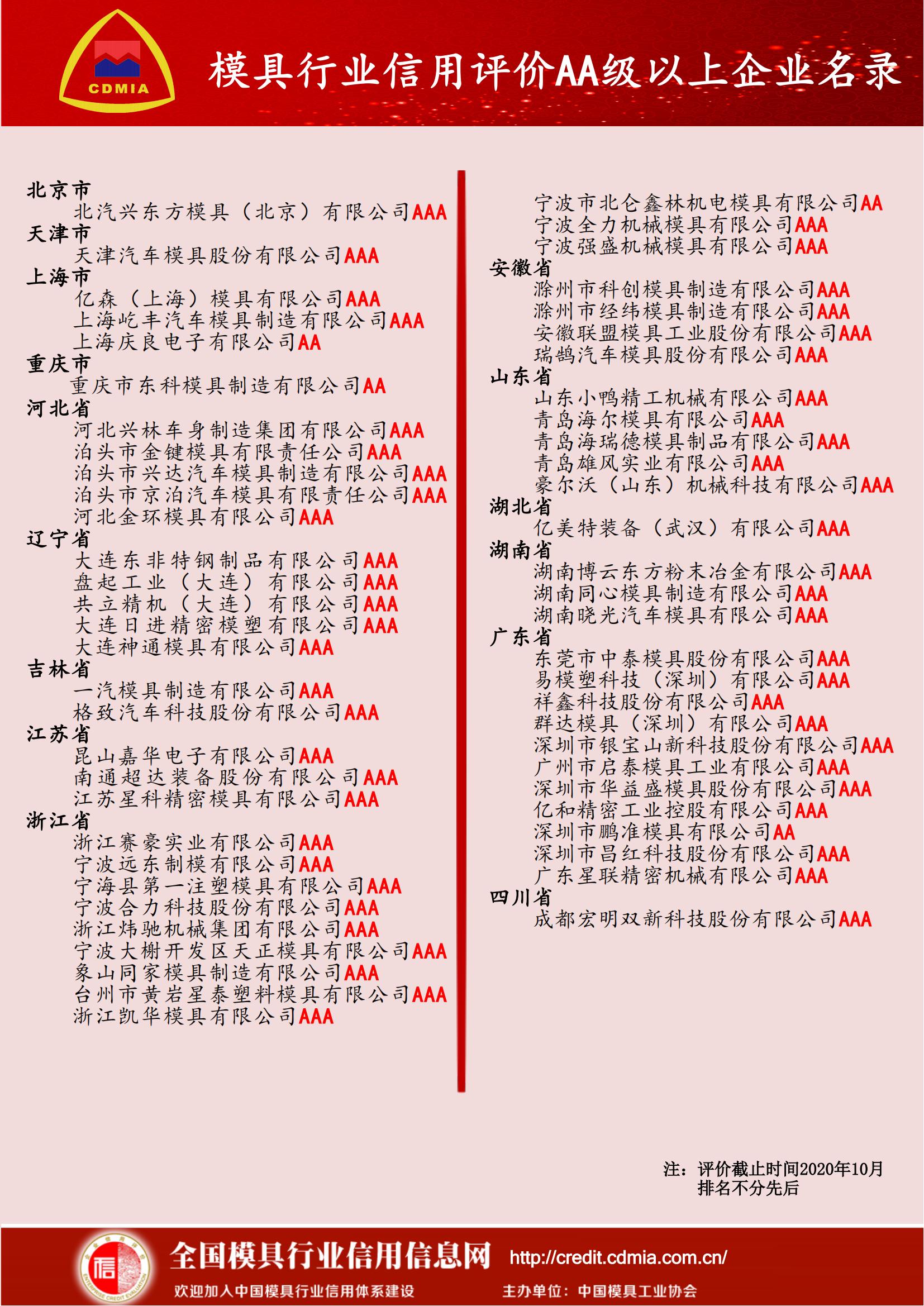 模具行業信用評價AA級以上企業名錄