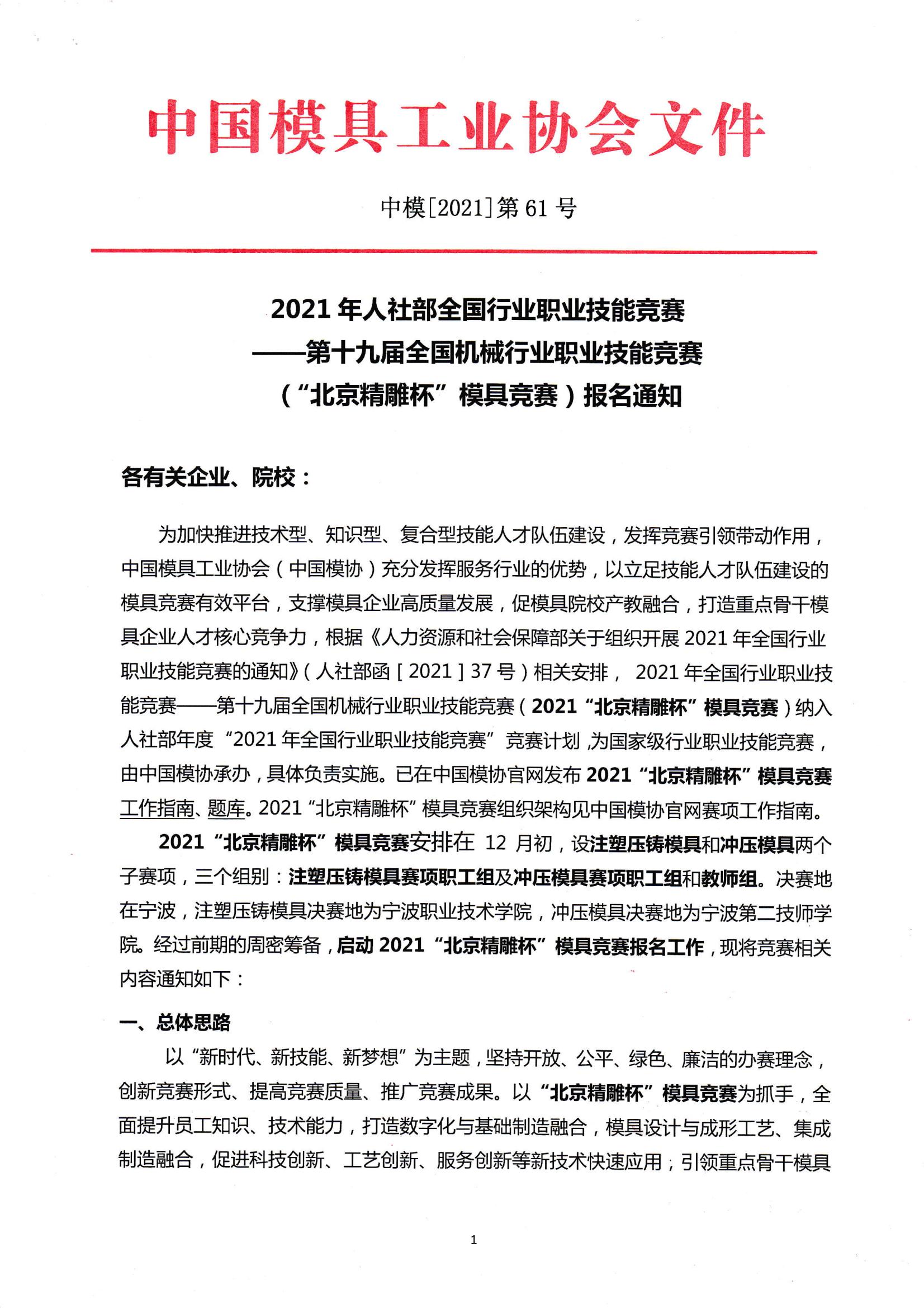 2021年人社部全國行業職業技能競賽——第十九屆全國機械行業職業技能競賽(“北京精雕杯”模具競賽)報名通知