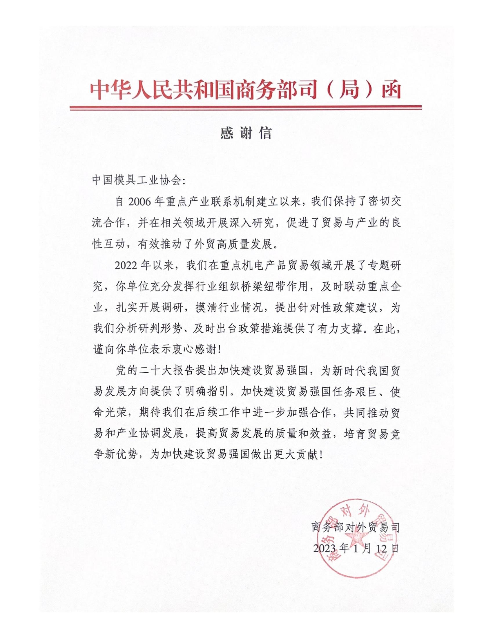 商務(wù)部對(duì)外貿(mào)易司致中國模協(xié)感謝信