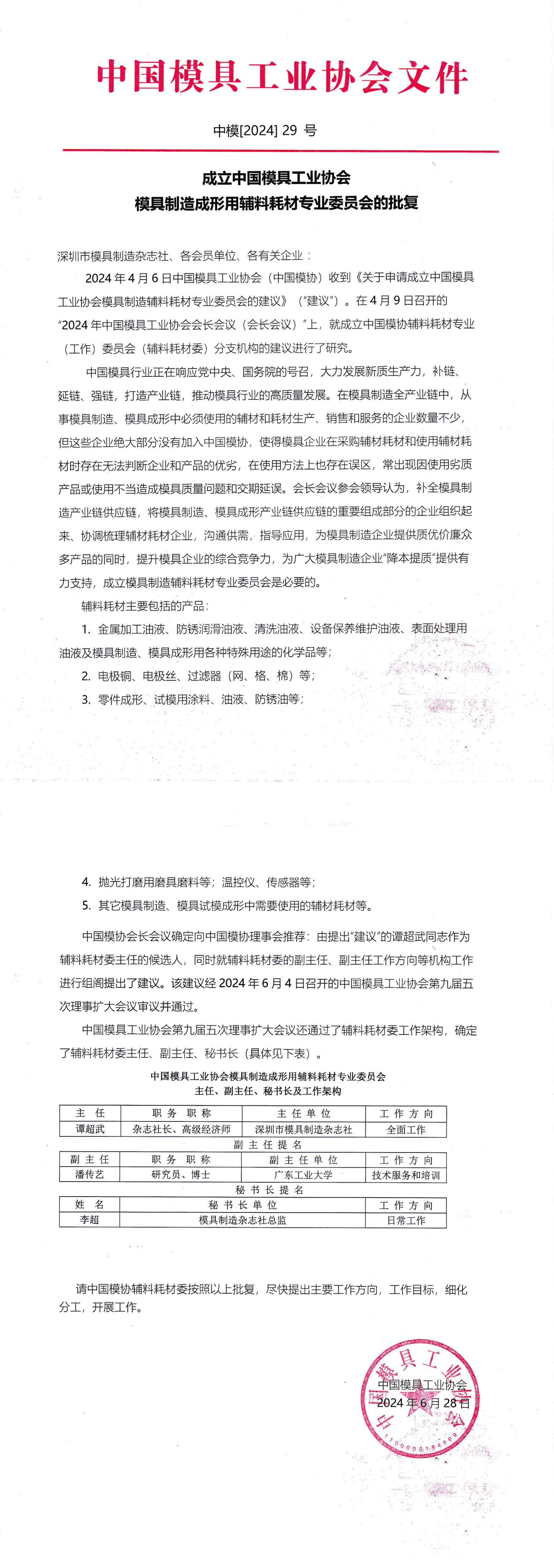 成立中國模具工業協會模具制造成形用輔料耗材專業委員會的批復