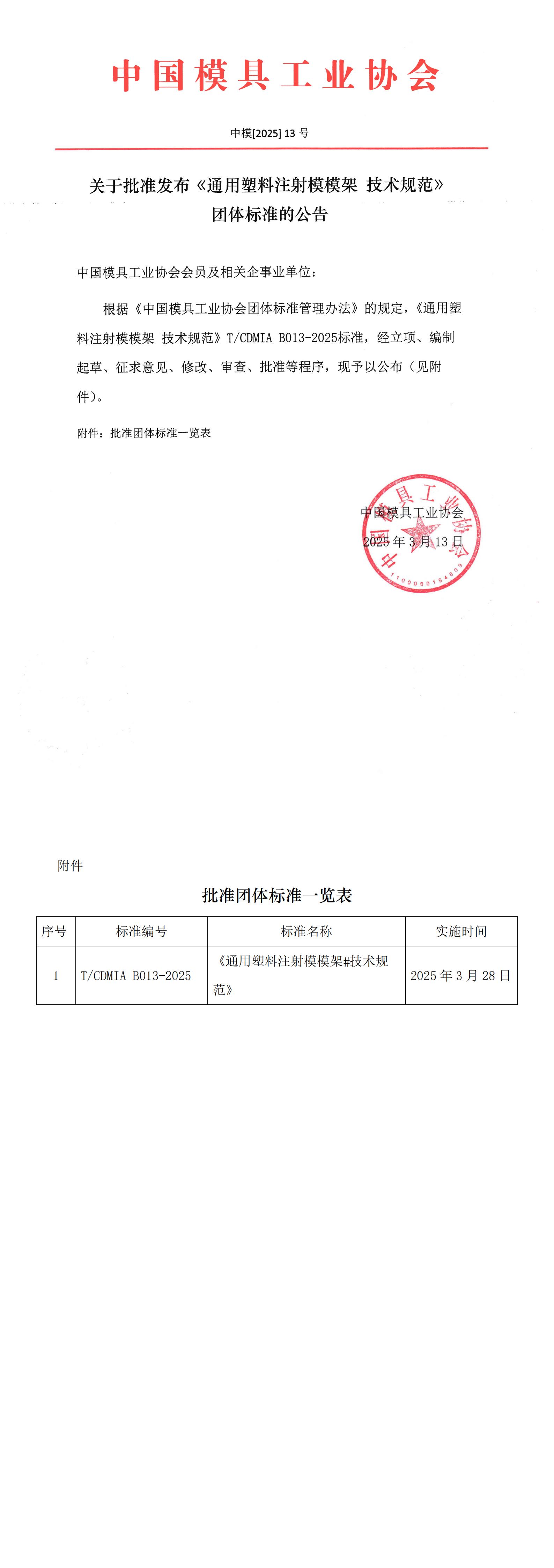 關于批準發布《通用塑料注射模模架 技術規范》團體標準的公告